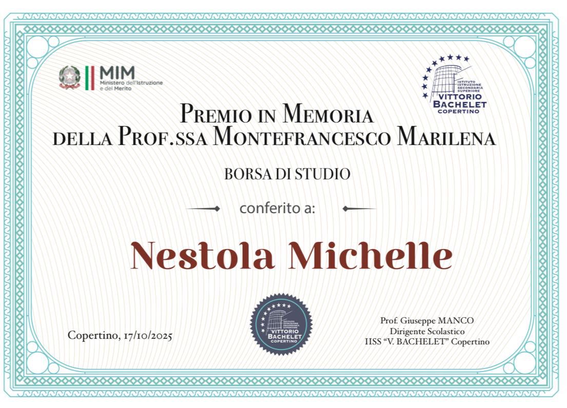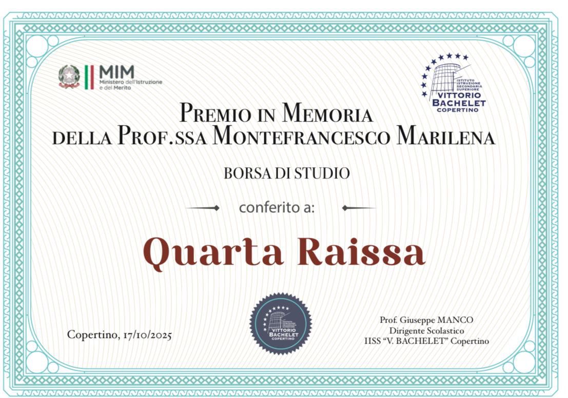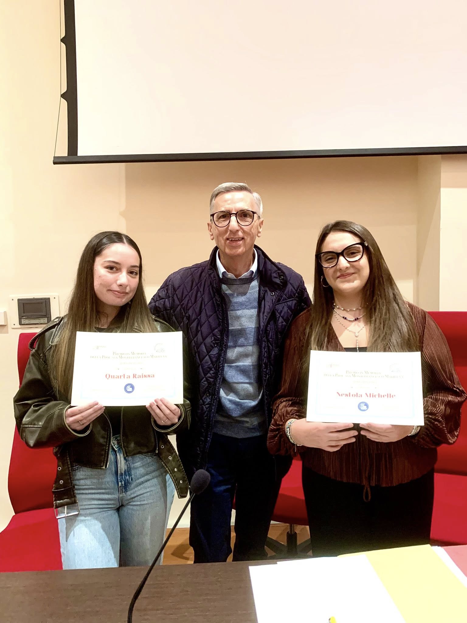 Il I premio in memoria della prof.ssa Marilena Montefrancesco è stato assegnato alle ex studentesse Quarta Raissa della classe 5^ BRIM e Nestola Michelle della classe 5^ BPCP per gli eccellenti risultati conseguiti durante l’intero percorso scolastico nello studio dell’economia aziendale e portato a conclusione con gli Esami di Stato nello scorso a.s. 2024/25.